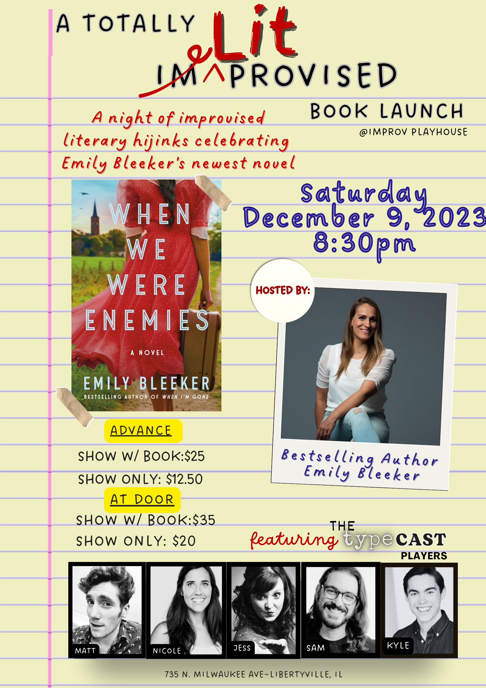 Saturday December 9th, 2023 at 8:30pm come celebrate the launch of WHEN WE WERE ENEMIES with a literature themed improv show hosted by ME (Emily Bleeker) featuring a lit-crazed improv team: The TypeCast Players.